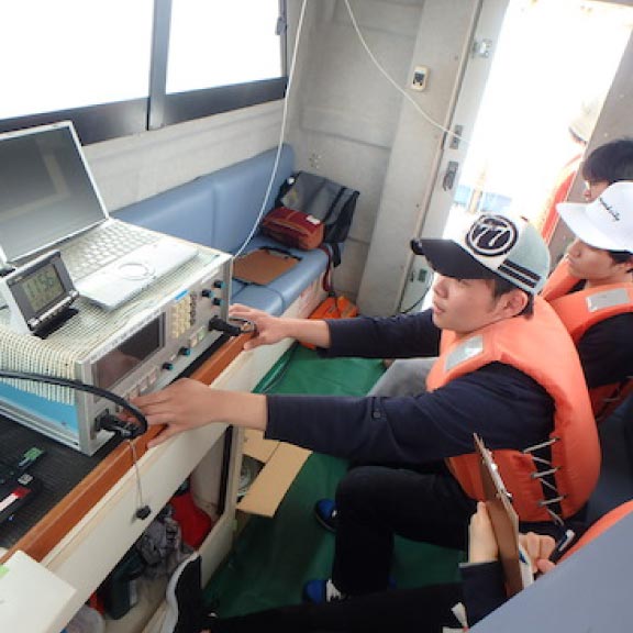 学内外の大学生対象に、海洋底探査の実習を行っています。